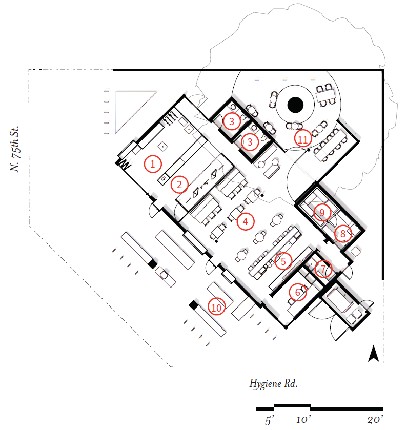 Through this adaptive reuse project in Hygiene, Colorado, the gas station is envisioned as a neighborhood hub, servicing the local bicycle culture and serving many of the craft brews that come from the surrounding area. The design pulls from more than 100 years of local history to compose a researched-based solution for the abandoned historic gas station, reintegrating it into the fabric of the community. Design theory, historic precedence, and local knowledge culminate to create a place that poetically intertwines local values with contemporary architectural language.